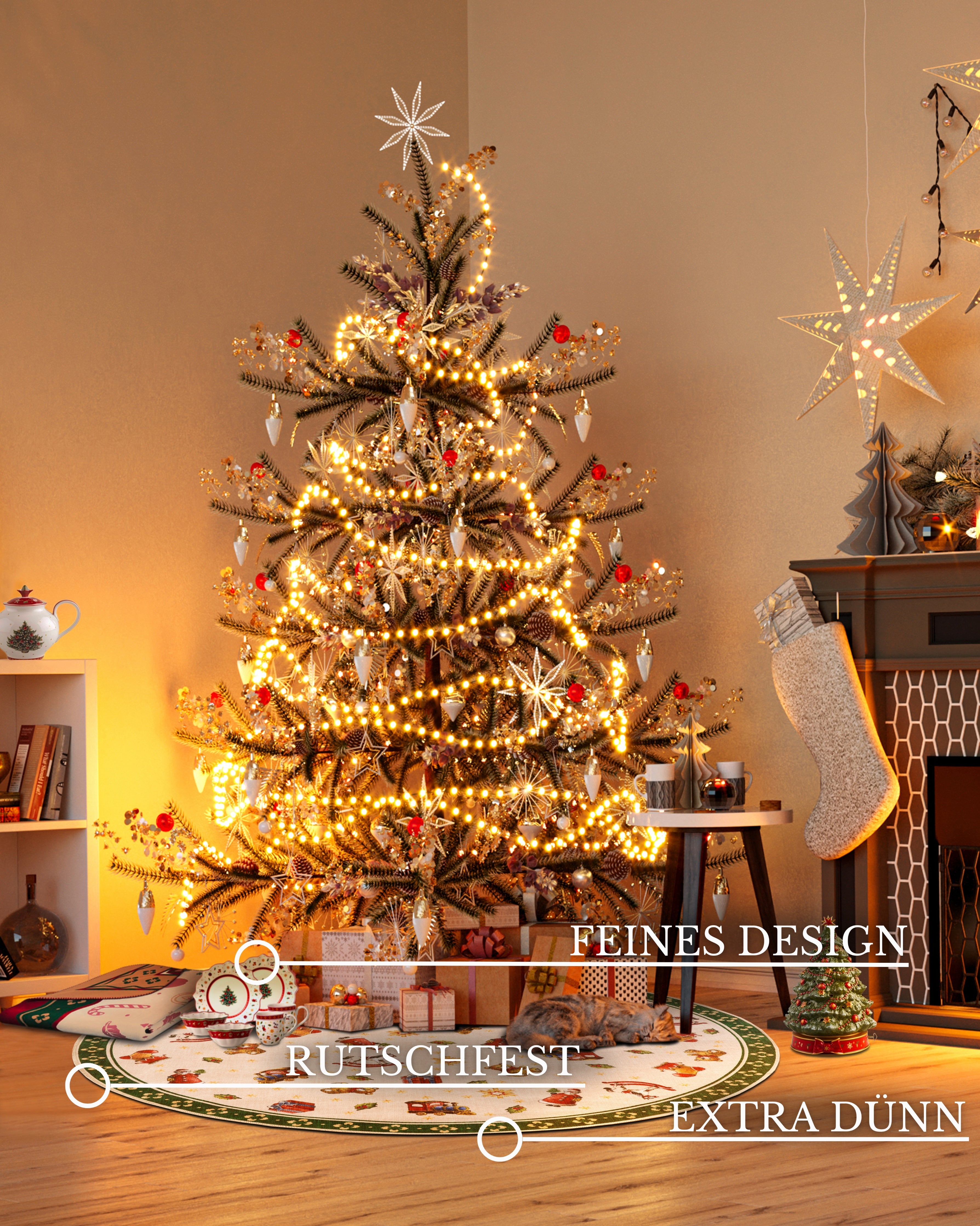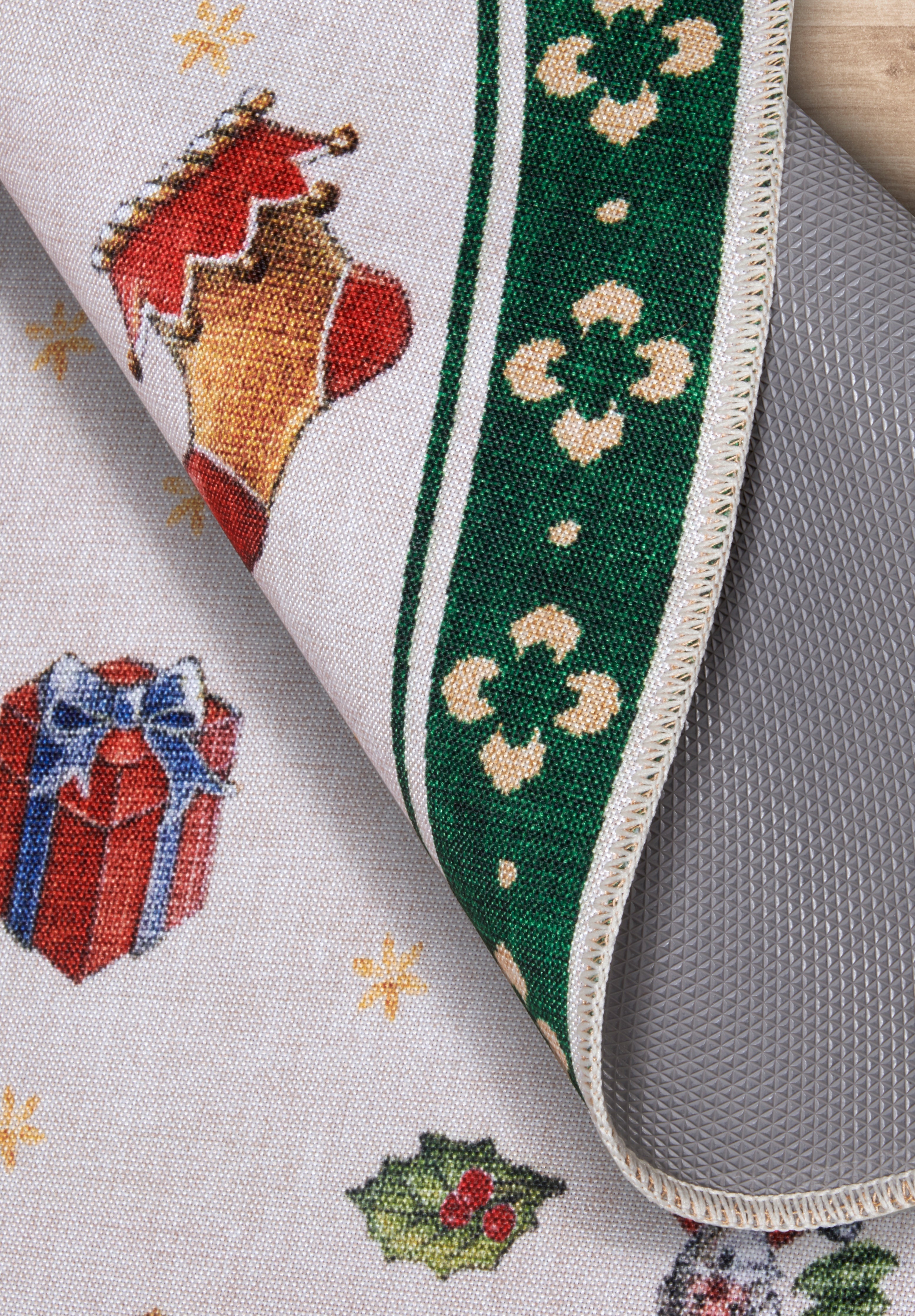 Tæppets bagside er fremstillet af 100% TPR, som sikrer et skridsikkert underlag – perfekt til leg og julehygge. Den robuste, "chained" kantafslutning forlænger tæppets levetid og bidrager til det elegante udseende. De slidstærke syntetiske fibre gør tæppet nemt at rengøre, så du kan nyde den festlige stemning uden bekymringer.
