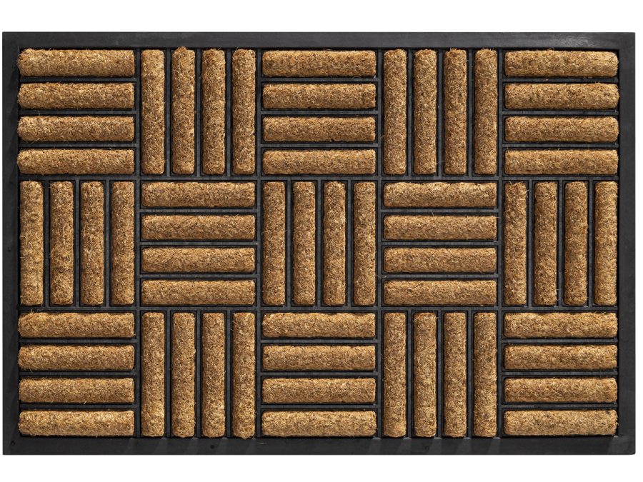 Kombineret kokos- og gummimåtte til fordøren. Det sorte gummi står i fin kontrast til den naturlige kokos, og du opnår fordelene fra begge materialer. Denne model har en gummibund med et kompakt grafisk mønster med lige kanter.