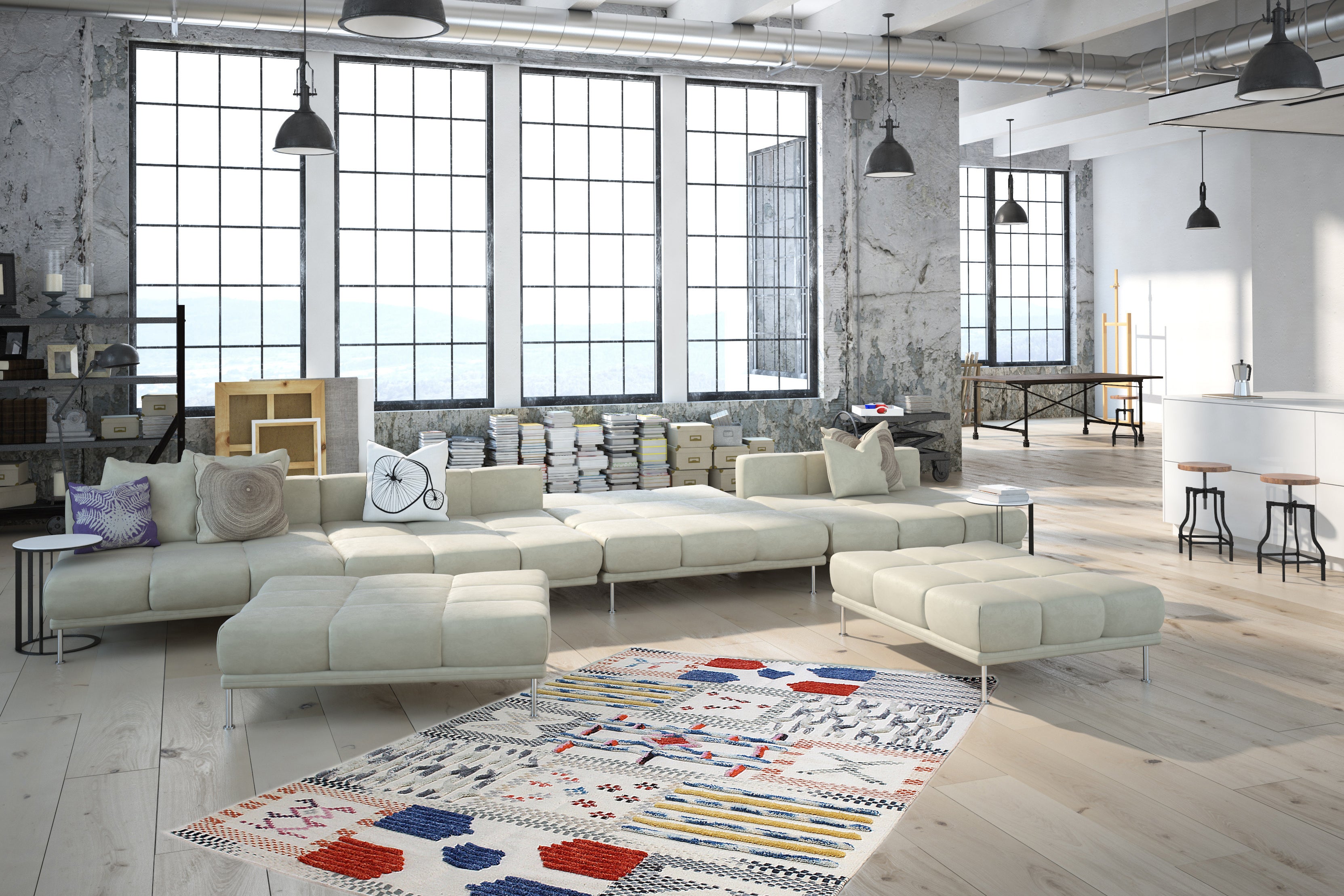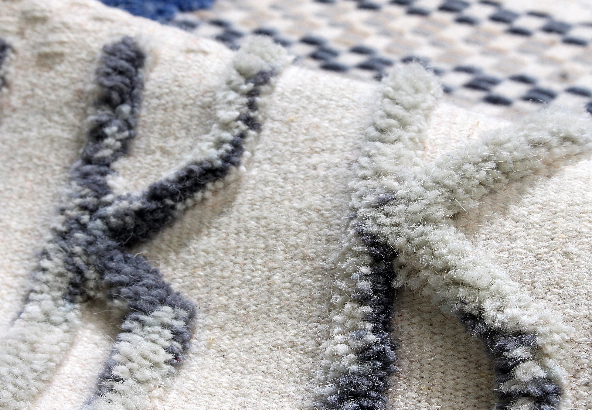 Dette smukke uldtæppe får sit særlige udseende fra sine geometriske former og forskellige farver. Trods variationen af farver er det fladluvede tæppe, med nogle ufarvede områder, ret diskret, hvilket gør det ideelt til at kombinere med mange indretningsstile. Uldtæppets designkomposition består af primærfarverne blå, rød og gul, samt sort, grå og hvid. Dette giver tæppet et spændende, men alligevel overskueligt udseende. Gentagelsen af de forskellige mønstre bringer en vis ro til tæppets struktur. De lyse farver er velegnede til at kombinere med både lyse og mørkere interiører. Materialeblandingen af høj kvalitet er af god kvalitet og består udelukkende af 80% New Zealandsk uld og 20% bomuld. Dette gør uldtæppet både smukt blødt og nemt at pleje og rengøre. Uanset om du placerer tæppet i din entré, stue, spisestue eller soveværelse, vil det se godt ud i ethvert rum. For at sikre, at den passer perfekt til dine behov, fås den i forskellige størrelser og kan også placeres på gulvvarme.