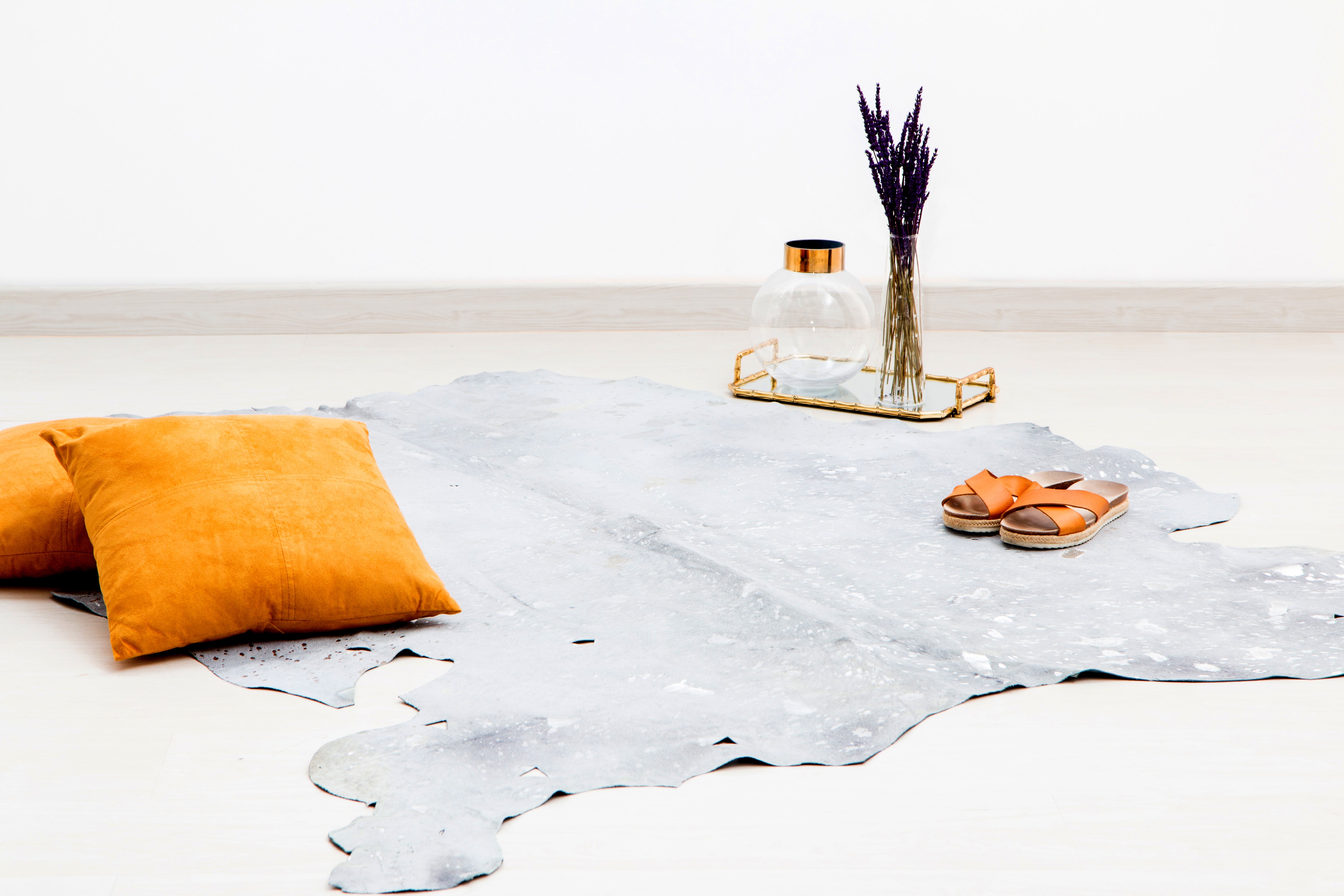Dette naturlige tæppe er lavet af ægte kohud og får sin karakteristiske karakter fra dets moderne farve, elegante metalliske accenter og naturlige konturer. Stilfulde udskæringer, der varierer i form og størrelse, giver tæppet et unikt udseende. Enkle, minimalistiske rum kan forbedres særligt godt med dette tæppe. Den lette vægt af den flade luv gør det muligt at bruge dette tæppe ikke kun som gulvbelægning, men også som vægophæng eller siddehynde. Dette giver dig mulighed for at indrette dit hjem efter dine egne ideer og fleksibelt variere brugen af tæppet. Læderet passer særligt godt sammen med andre naturlige materialer såsom træ eller rotting. Hyggefaktoren forstærkes ved at kombinere det med smukke puder eller siddehynder lavet af naturlige materialer, hvilket skaber en behagelig atmosfære i hele rummet. Du vil modtage et unikt stykke, der på grund af det naturlige materiale kan variere med op til 30% i tekstur, struktur, form og farve. Det naturlige skind er farvet og kan fælde hår og bløde lidt ud over tid og ved kraftig brug. Metallfolien kan også skalle af under visse omstændigheder. Dette skyldes produktets naturlige natur og hudens tekstur og er ikke en fabrikationsfejl.