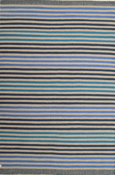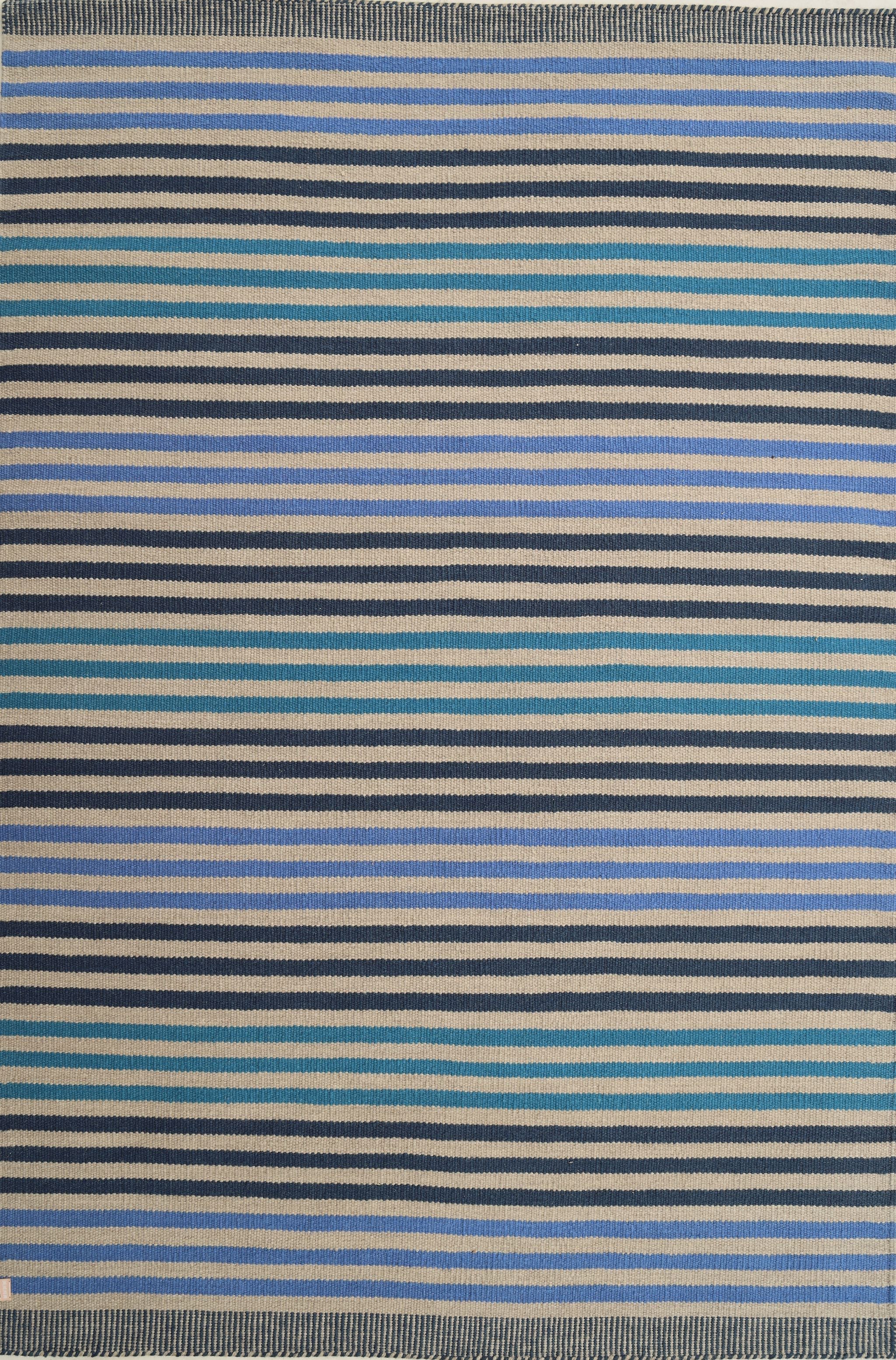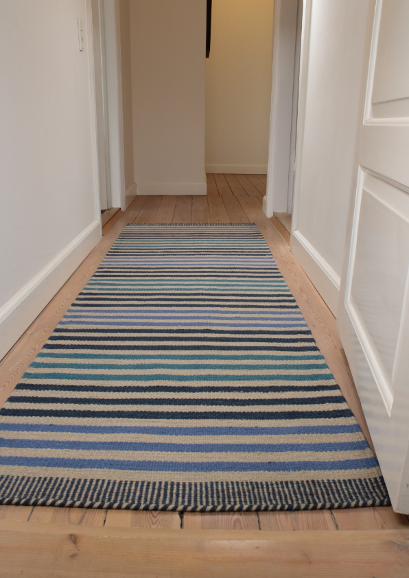 Skab varme og karakter i dit hjem med dette smukke, vendbare kelim-tæppe, håndknyttet i 100% uld. Tæppet præsenterer et levende og harmonisk stribemønster i jordnære nuancer af blålige farver som tilfører både farve og ro til ethvert rum.