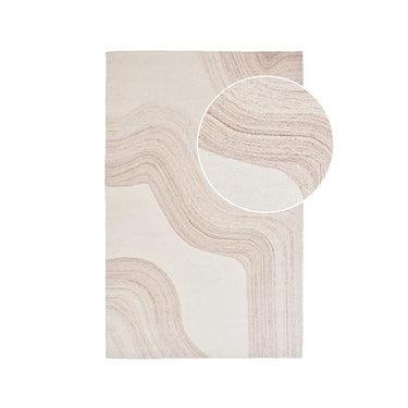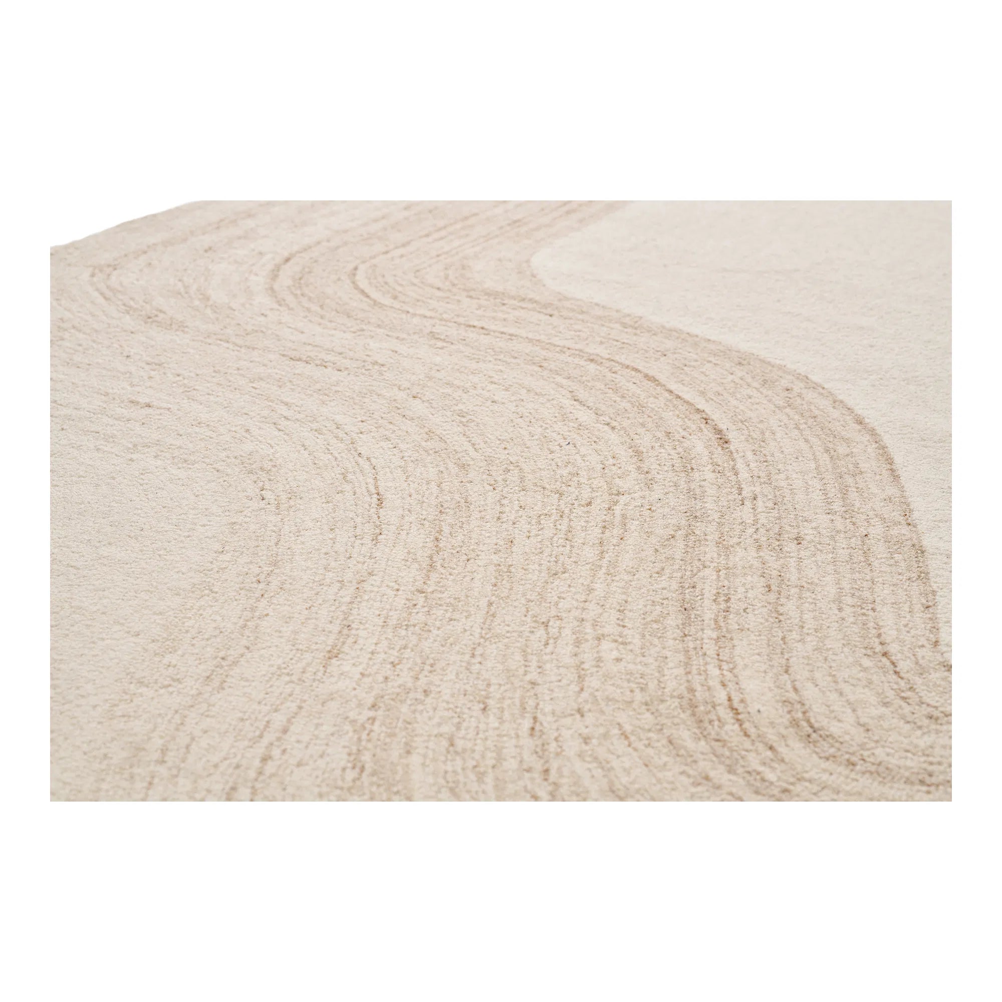 Tilføj en touch af komfort og stil til dit hjem med vores elegante uld tæppe. Dette tæppe er designet med fokus på både æstetik og funktionalitet, og det vil være et perfekt supplement til enhver indretning. Tæppet kommer i en smuk kombination af lysebrun og råhvid, og har et spændende mønster med kurvede former, der giver et dynamisk og kunstnerisk udtryk.