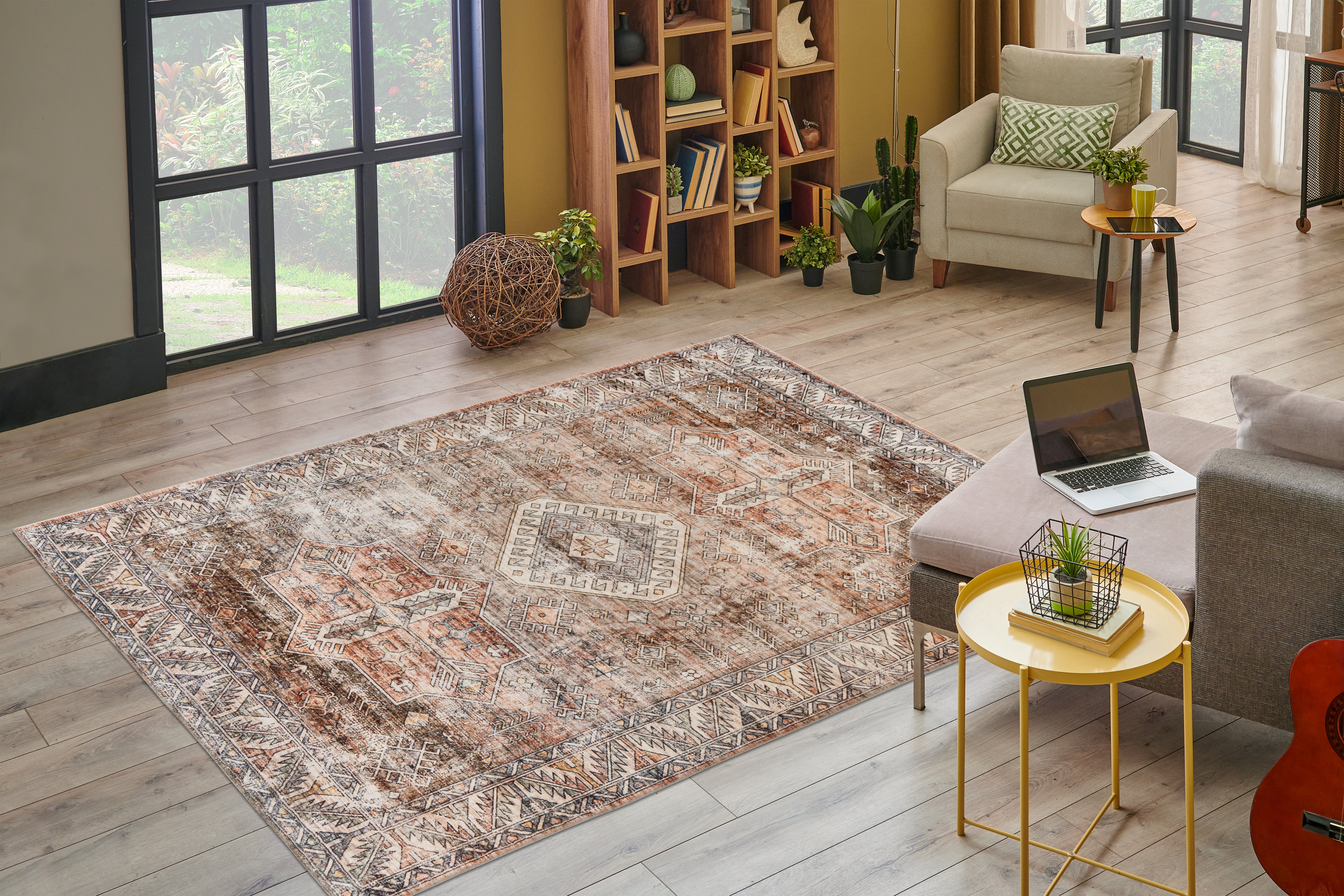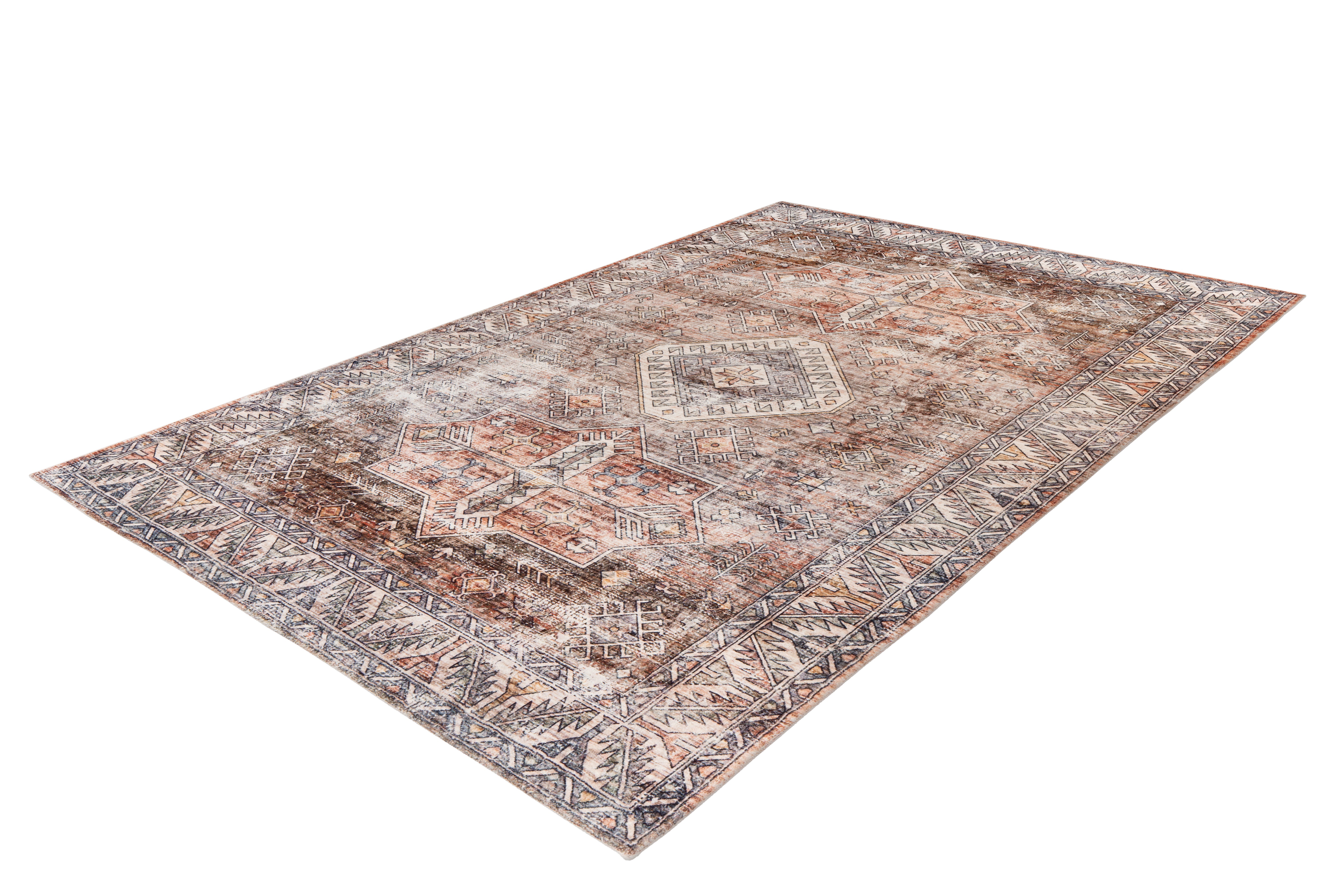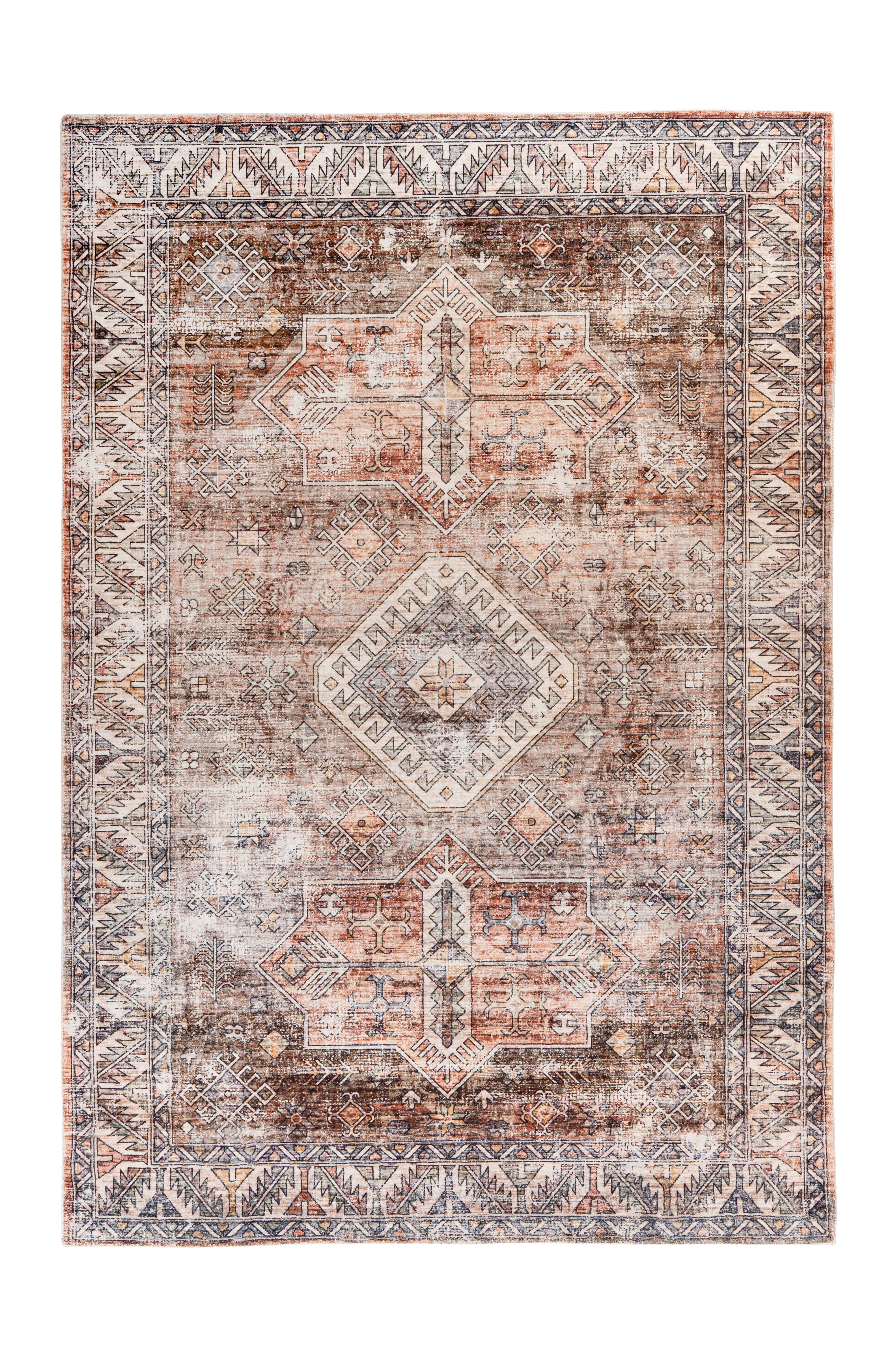 Dette individualistiske tæppe fås i forskellige designs og størrelser. Det udførlige digitaltryk giver dette maskinvævede tæppe et slående udseende. Med sit moderne vintage-look og forskellige størrelser tilpasser det sig ethvert rum og er et sandt højdepunkt!
