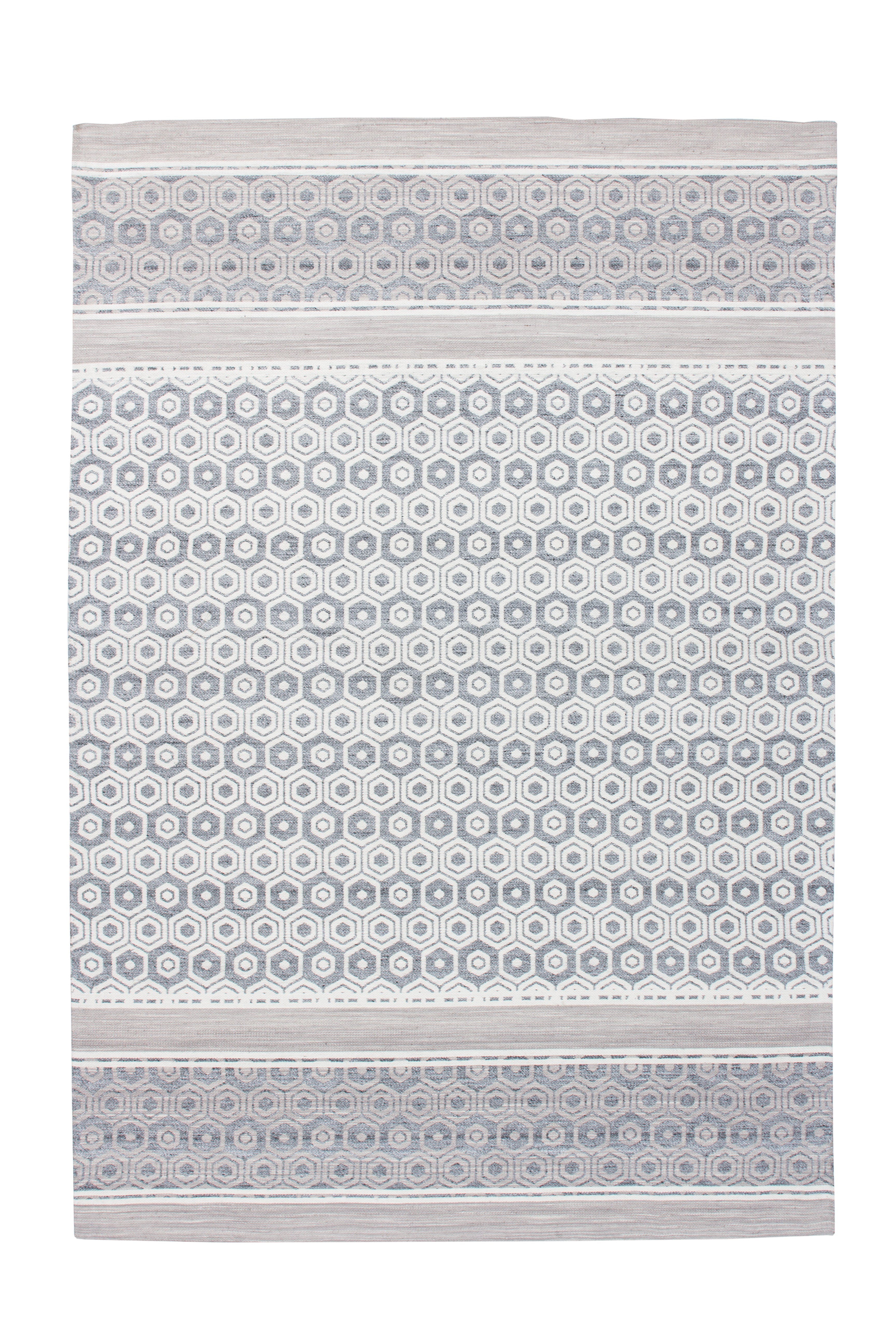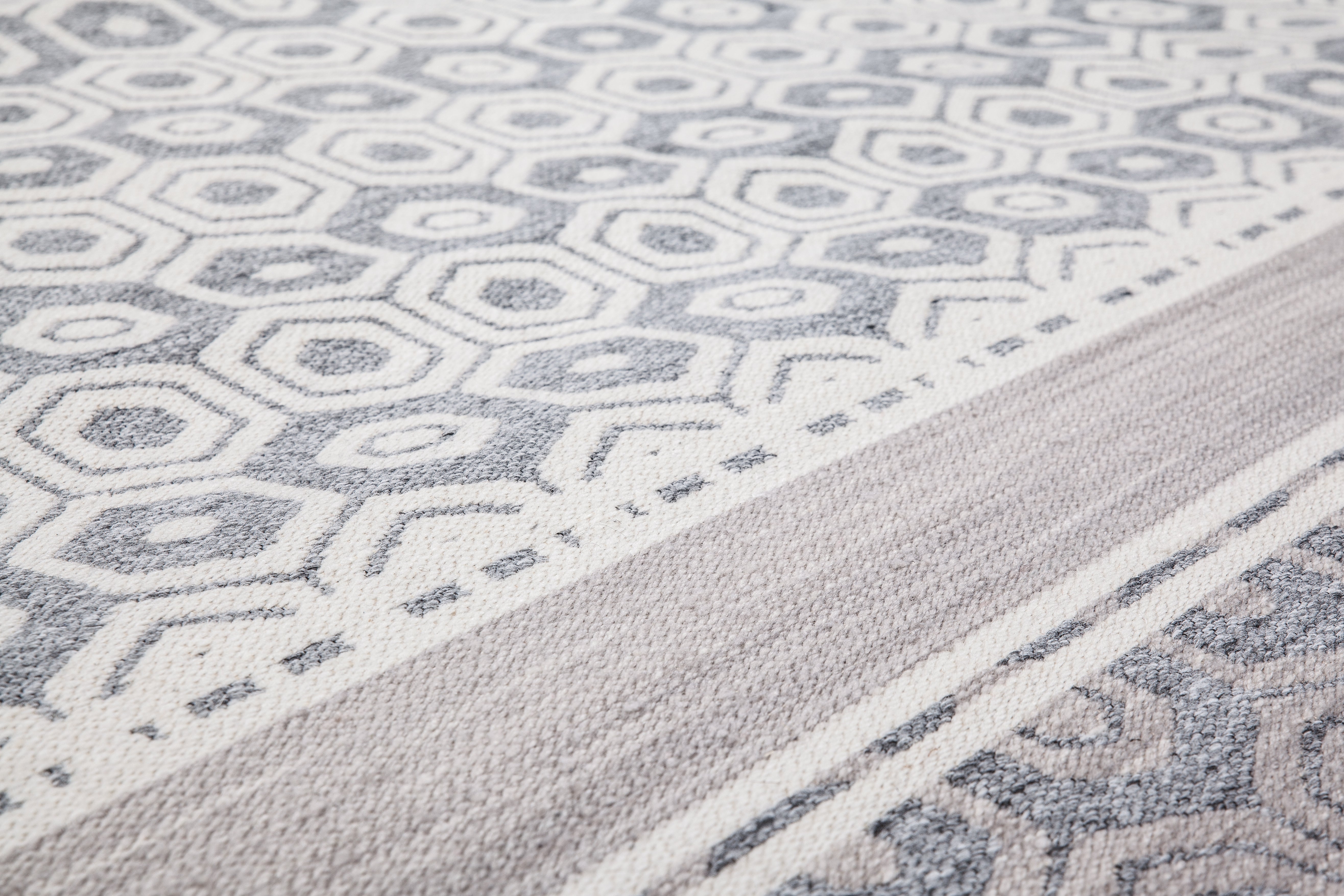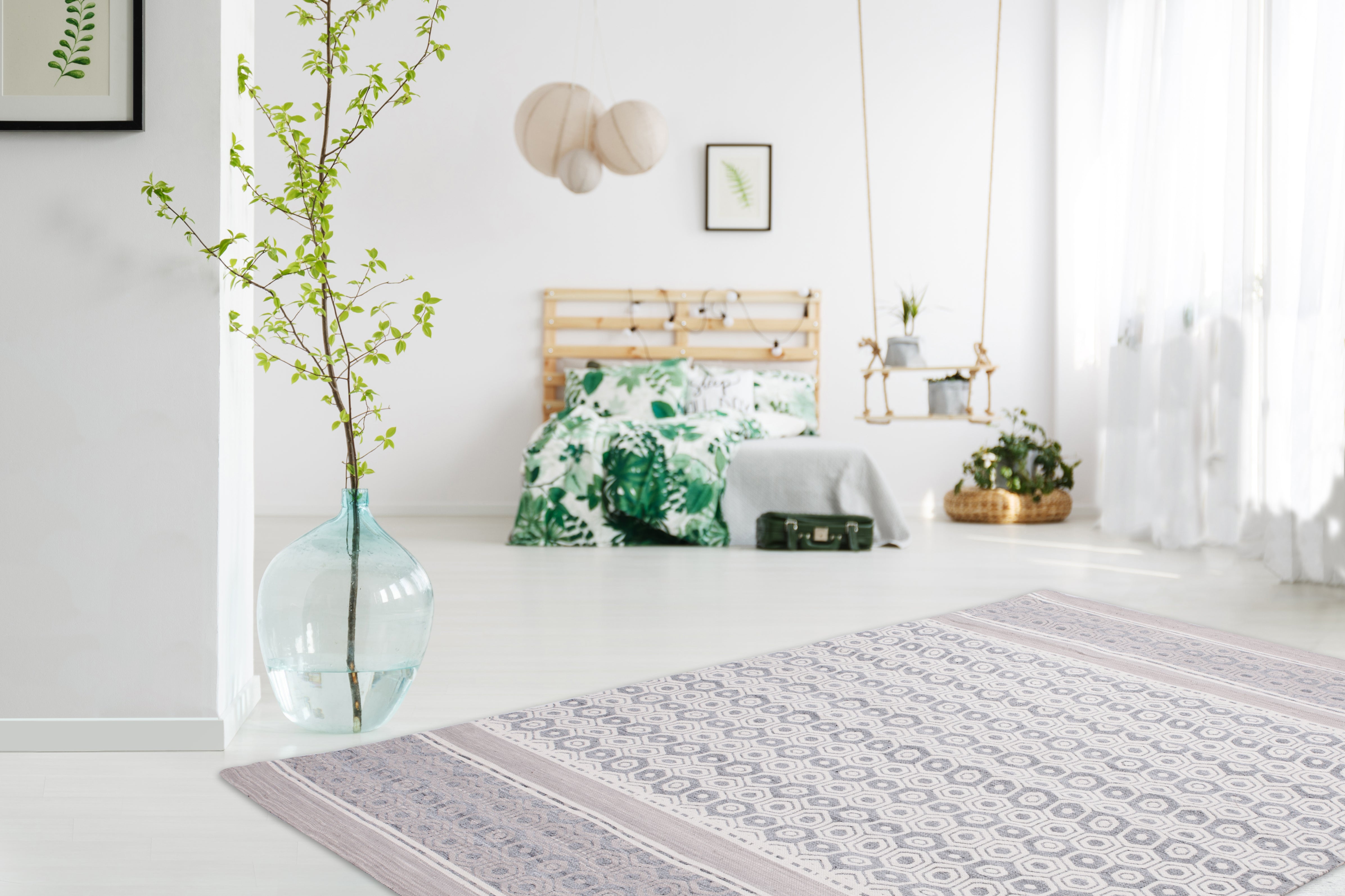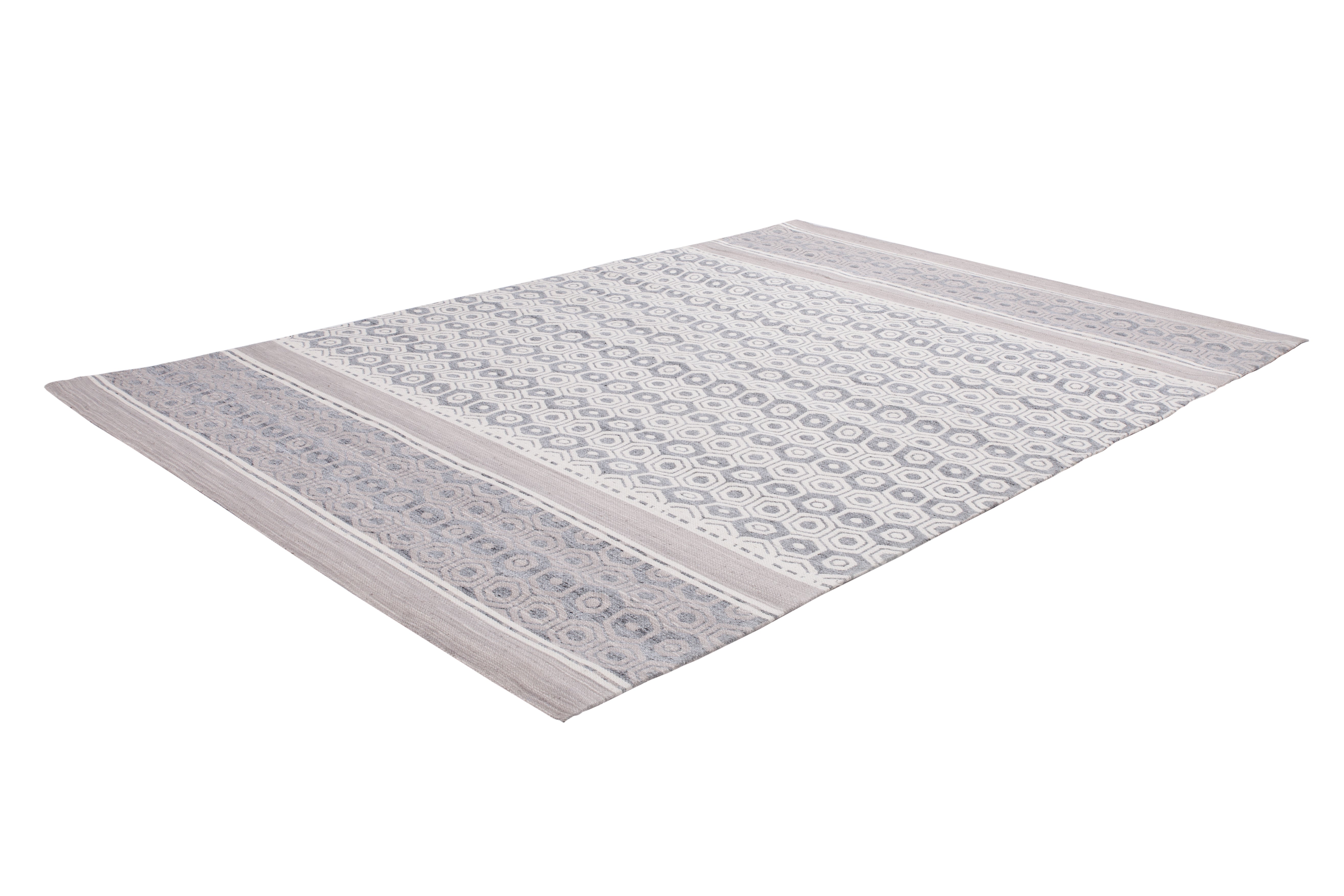 Med sine enkle og lyse farver passer dette tæppe ind i ethvert interiør. Dette fladluvede tæppe ser godt ud på både lyse og mørke gulve. Den bløde blanding af uld og viskose føles meget behagelig under fødderne og lover glæden ved at gå barfodet. Forskellige størrelser, farver og mønstre på dette tæppe giver dig mulighed for at finde den rigtige mulighed for dig. Uanset om det er moderne eller klassisk, rustikt eller tidløst - dette håndlavede tæppe vil passe til din indretning! Placer denne model med bomuldsbagside i din stue eller soveværelse og tilfør et strejf af hygge. De smukke jacquardmønstre på tæpperne er iøjnefaldende i forskellige arrangementer og former, enten individuelt eller i kombination. Mønstre, farver og størrelser kan variere en smule på grund af håndværksprocessen.